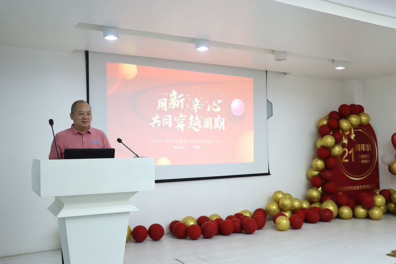 本次周年庆活动在创世科技总经理张传金的精彩致辞中拉开序幕,首先他带领全体员工回顾了公司过去二十一年来所取得的成绩以及克服的各种困难,感谢全体员工一直以来的辛勤付出与奉献,鼓励大家继续发扬创世人不屈不挠的奋斗精神,勇敢面对复杂的外部环境和激烈的市场竞争,坚持做难而正确的事,不断的创新,用更多新产品、新技术、新模式去穿越周期。他表示我们抵御了疫情,也必将能战胜其他一切挑战。