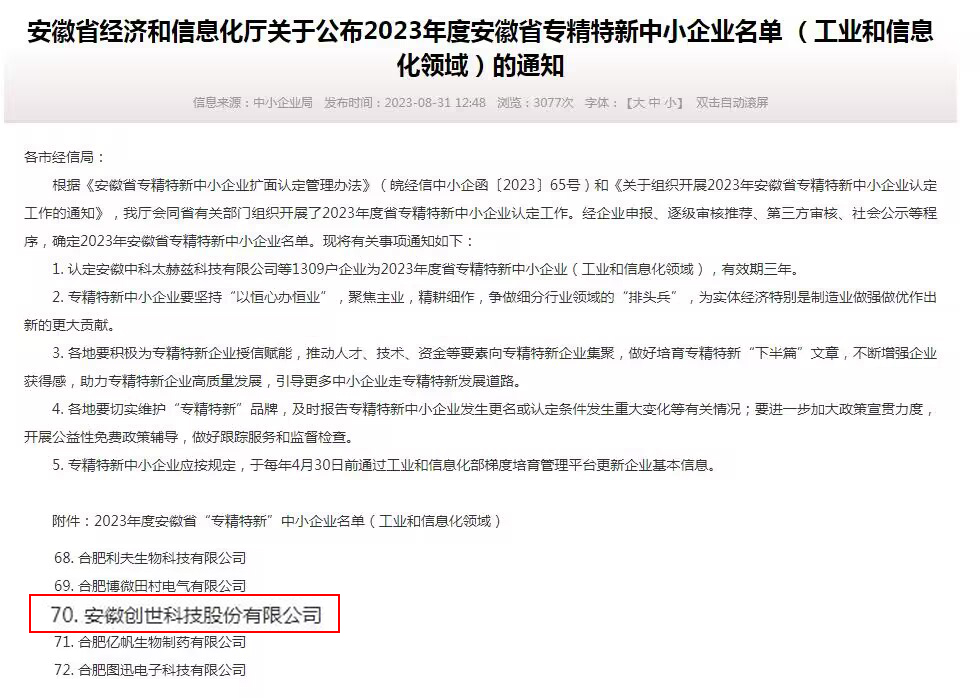 近日,安徽省经济和信息化厅公布了2023年“专精特新”中小企业名单,安徽创世科技股份有限公司被评为安徽省“专精特新”中小企业。这是政府部门对创世科技技术能力、创新能力、专业度和市场地位的认可,也是创世科技长期坚持技术创新引领战略结出的又一硕果。
