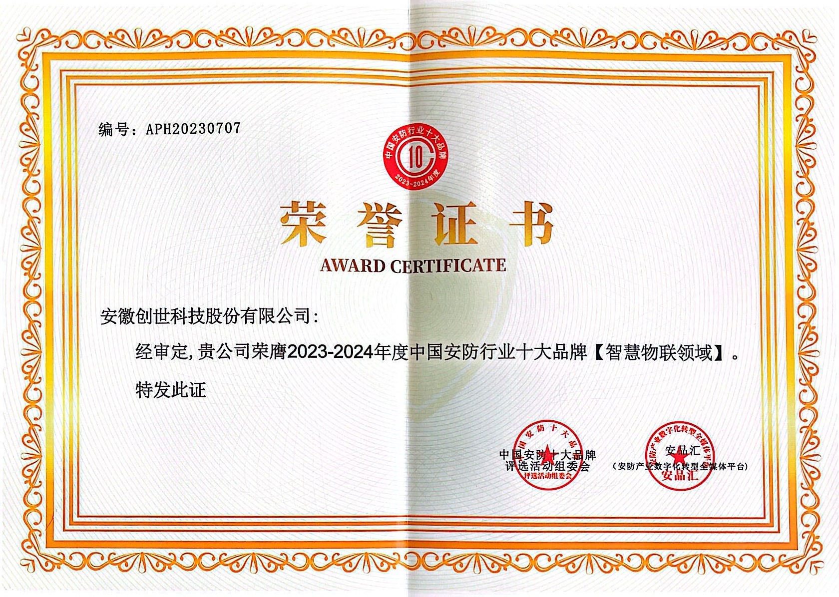 2023年12月22日,“2023-2024年度中国安防行业十大品牌”颁奖盛典在湖北武汉顺利举行。安徽创世科技股份有限公司凭借多年来在智能物联领域的深耕和持续创新,荣获“中国安防行业十大品牌【智慧物联领域】”荣誉称号。