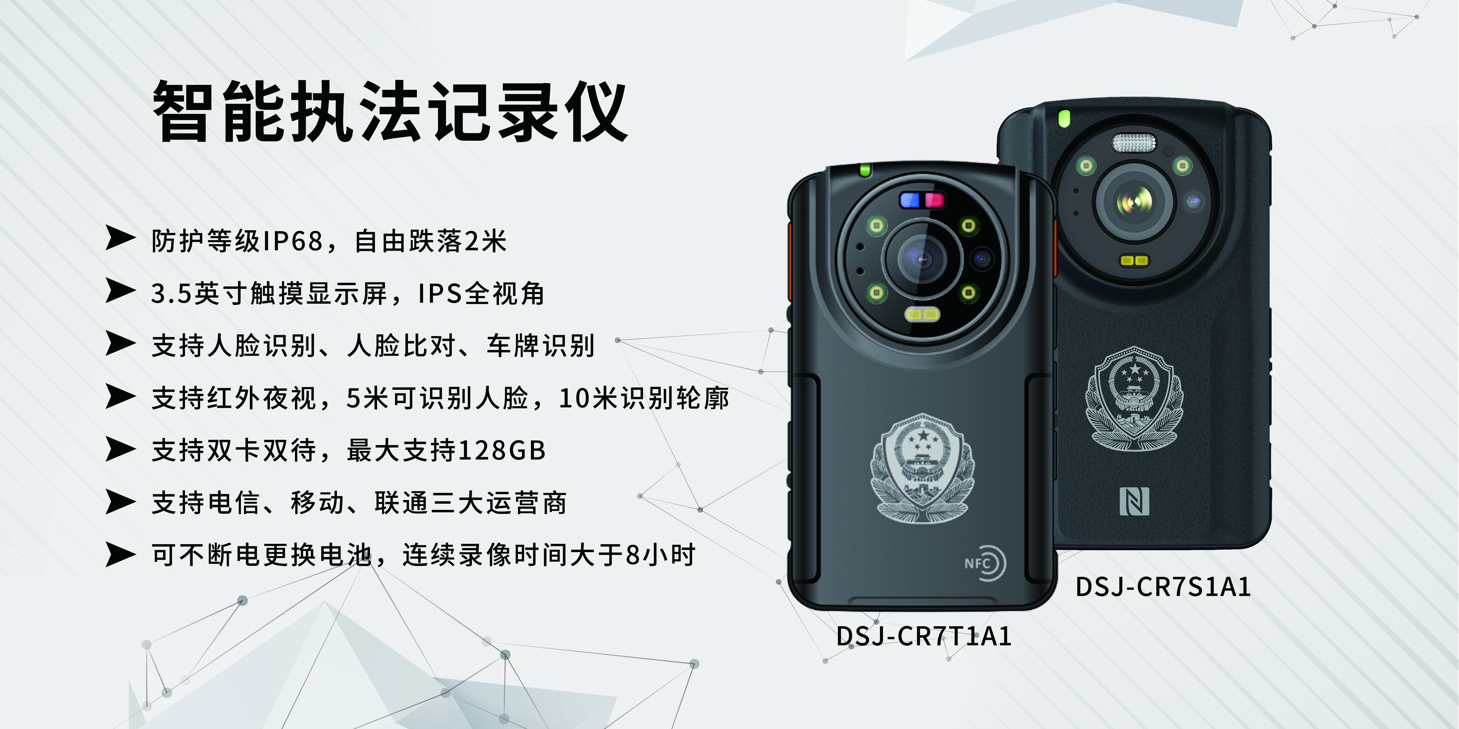 智能执法记录仪采用三防等级设计、安卓操作系统、专用按键搭配及盲视操作设计,支持双卡双待,配合3.5寸高清视网膜大屏,体型小巧易携带,可实现数据上传、红外夜视、执法取证、车牌识别、人脸识别、语音通话、视频会议等功能,通过搭配专业扩展配件,能够对执法过程中进行动态、静态的现场情况数字化记录,便于公安干警在各种环境中执法使用。